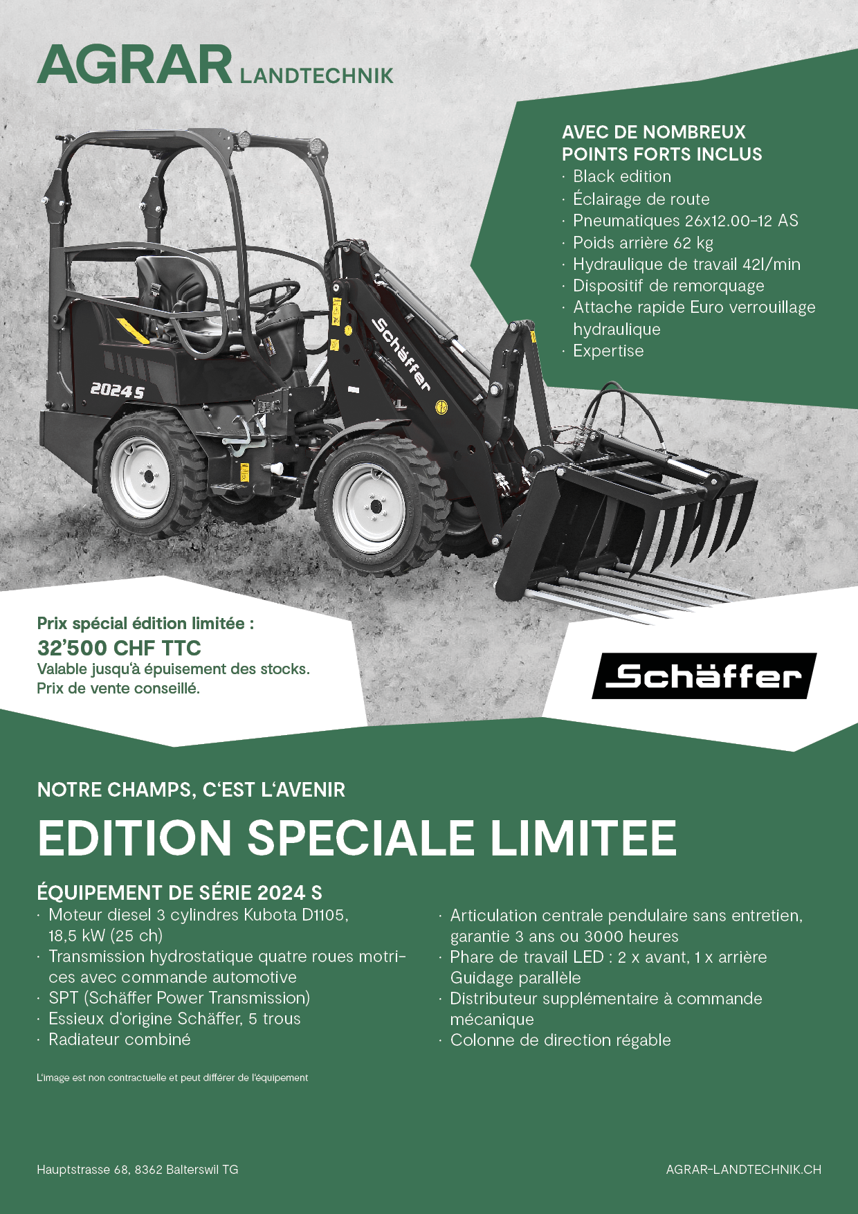 L'édition limitée Schäffer 2024 S est maintenant disponible chez Agrar Landtechnik AG, au prix spécial de 32 500 CHF TTC (dans la limite des stocks disponibles).